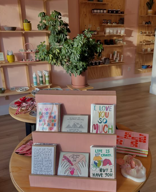 Easy Does It is filled with objects chosen for comfort and quiet delight - affirmation decks, journals, jewelry, notebooks, candles, bath salts, hair accessories, cards, and a growing selection of vegan snacks and artisan treats. The shelves also hold a collection of miniatures - tiny ghosts, snakes, flower arrangements, and small ceramic pots - that seem to spark joy simply by existing. Nearly half the inventory is made by local artists, many of whom work on consignment. “I am very passionate about supporting local artists. What I did not anticipate was how fun it would be to form relationships with all of these makers. So many of them are my friends now.” -